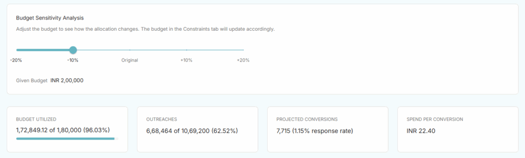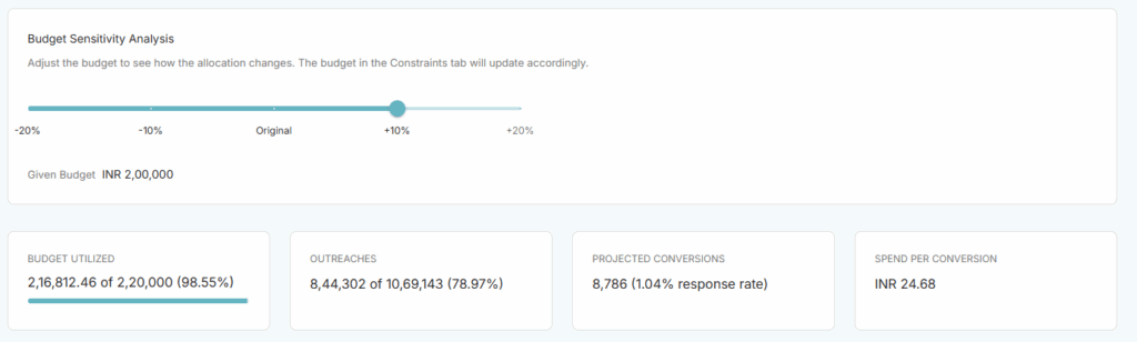 This gives you a clear sensitivity curve. If an extra 10% budget yields a massive jump in expected returns, you immediately have the data-driven justification to ask for more budget. Conversely, if cutting the budget to 90% barely impacts your conversions (because the optimizer trims out only the least efficient outreaches), you know you can safely save those dollars.